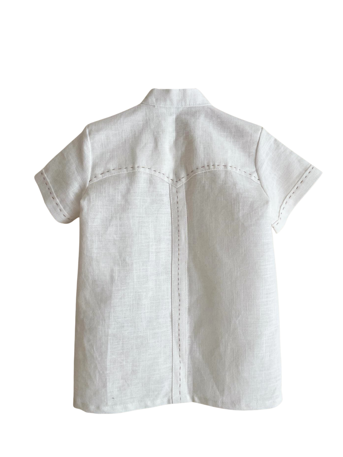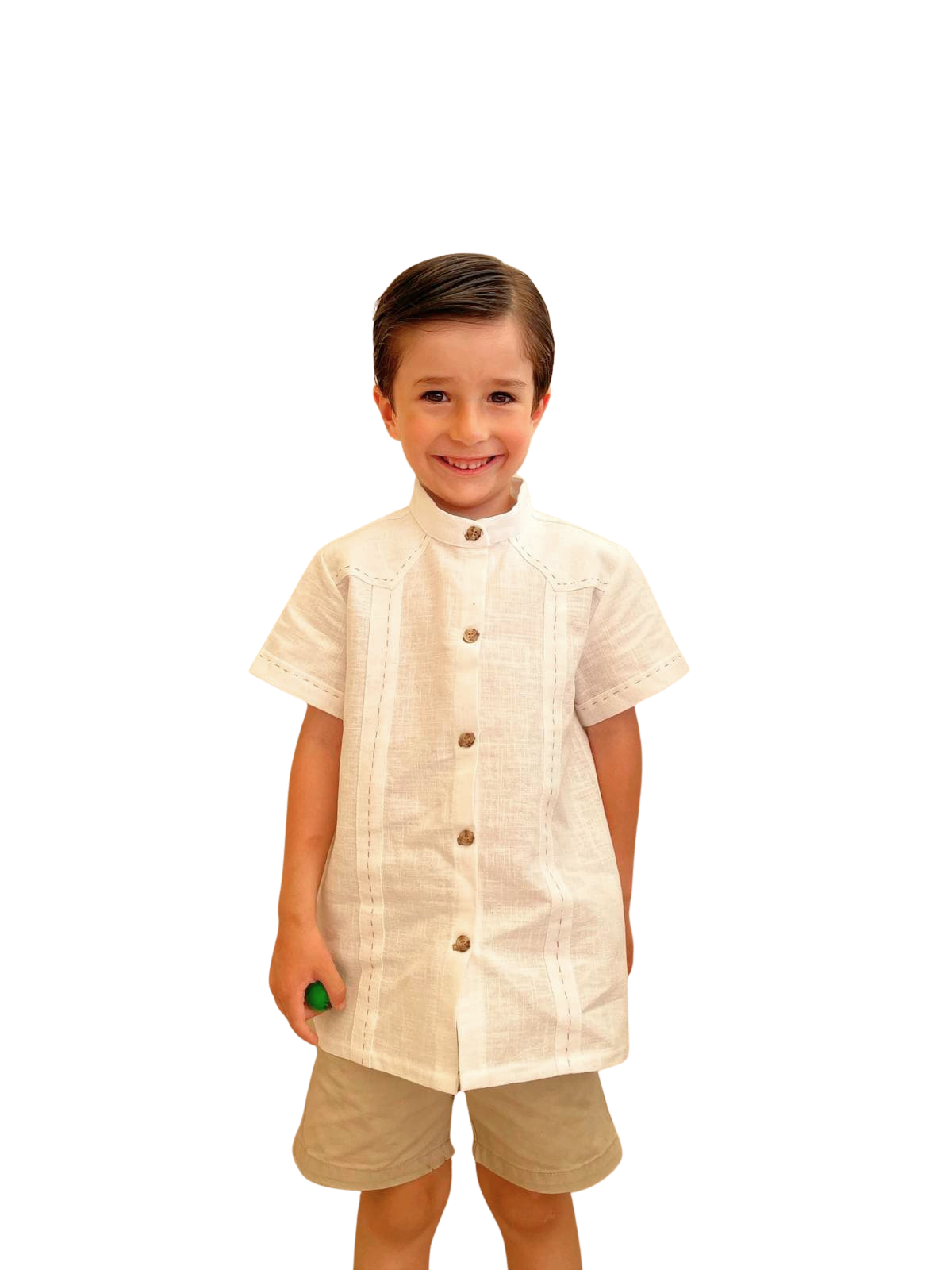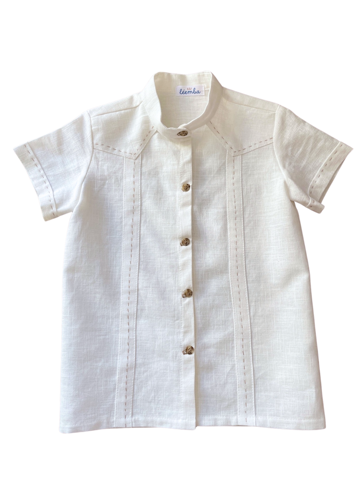 Camisa estilo «GUAYABERA» mexicana con cuello mao, manga corta y con pespuntes realizados a mano de color camel en las franjas delanteras, en el canesú trasero y en el bajo de las mangas.